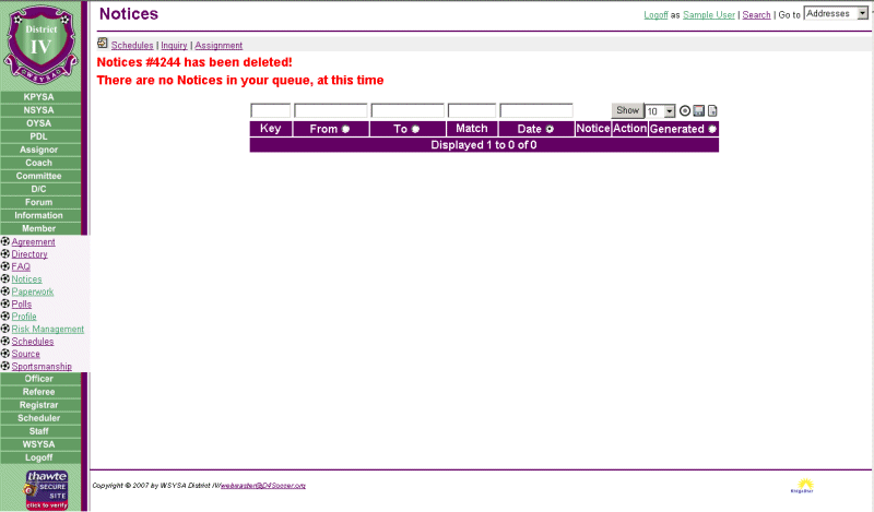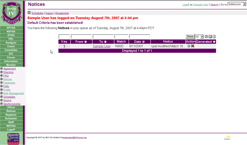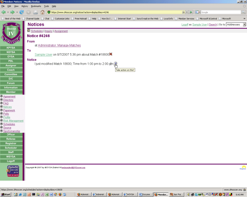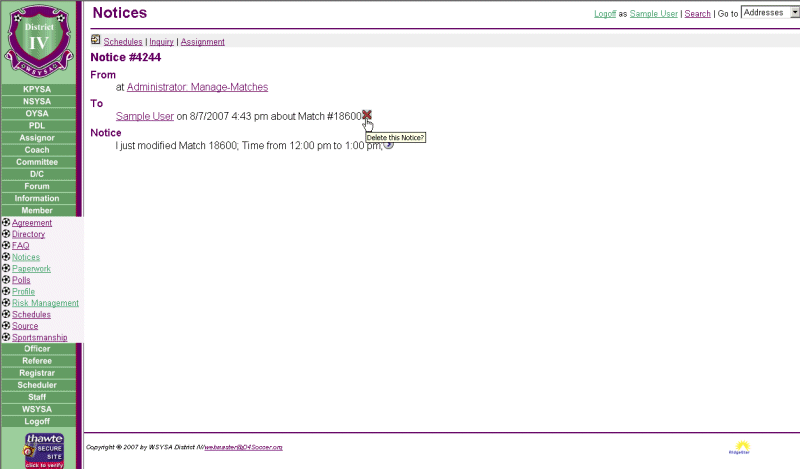 If you have received a Notice and do not understand Why or what is Telling You, simply contact the Webmaster via e-mail (webmaster@d4soccer.org) and reference the Notice # that is at the top of the display when the Notice is Open (see picture below)- Notice #4244